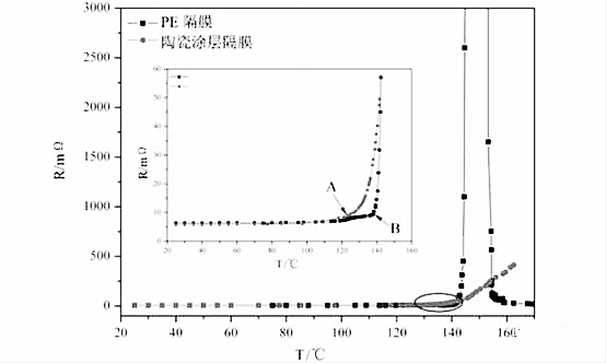 PE隔膜在溫度高于其熔點(diǎn)溫度下會(huì)發(fā)生大面積收縮,從而使得電池內(nèi)部正負(fù)極極片直接接觸導(dǎo)致內(nèi)部短路因此所測(cè)電池內(nèi)阻迅速降低;然而對(duì)于涂覆涂層的隔膜即使在150℃下烘烤其隔膜本身形態(tài)不會(huì)發(fā)生變化,因此電池內(nèi)部不會(huì)出現(xiàn)短路情況從而使得電池內(nèi)阻仍在增加。PE隔膜在高溫環(huán)境下會(huì)喪失機(jī)械穩(wěn)定性能,從而導(dǎo)致電池內(nèi)部發(fā)生正負(fù)極直接接觸導(dǎo)致短路,而陶瓷涂層隔膜由于具有耐高溫性能從而有效防止電池內(nèi)部發(fā)生短路,提高電池的安全性能。